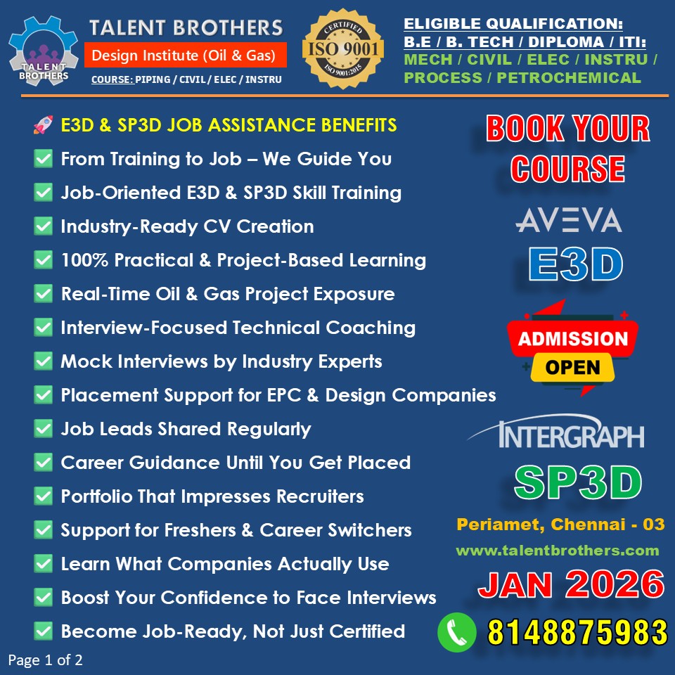 E3D & SP3D software training in Tamil Language From July 2025 Classroom Training Admission OpenTalent Brothers Piping InstituteSP3D & E3D...